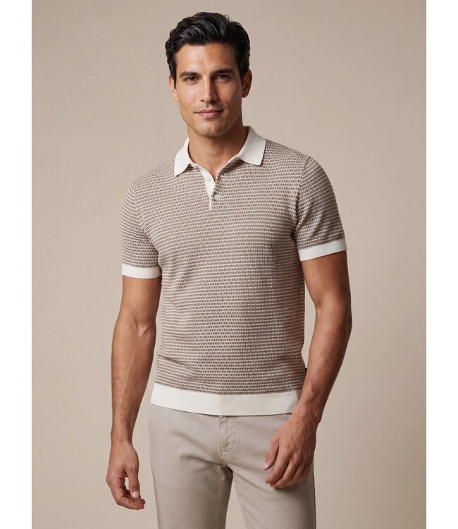 Ontdek de Multipo Polo, een stijlvolle gebreide polo in de kleur taupe. Deze polo is uitgevoerd in een beige, taupe en off-white katoenjacquard voor een grafische, eigentijdse uitstraling. Gemaakt van 100% katoen biedt de Multipo Polo een zachte, ademende kwaliteit en optimaal draagcomfort. De regular fit zorgt voor een tijdloze pasvorm, terwijl de contrastkleurige polokraag en biezen bij de mouwen een moderne touch toevoegen. Perfect te combineren met jeans, een chino of pantalon. De Multipo Polo combineert vakmanschap, stijl en comfort en is een veelzijdige must-have voor iedere garderobe.